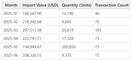 The distribution indicates that March was the busiest month, accounting for over 23% of total imports. The slight decline in May–June points to seasonal adjustments in procurement or customs scheduling rather than reduced demand.