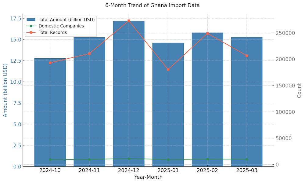 Over the past six months, Ghana’s import performance has shown cyclical variation. From October 2024’s $1.28 billion to a peak of $1.72 billion in December 2024, followed by a contraction to $1.46 billion in January 2025, trade volumes stabilized in February before a minor retreat in March. The number of domestic companies involved also mirrored this pattern, suggesting a direct relationship between corporate engagement and overall trade volume.