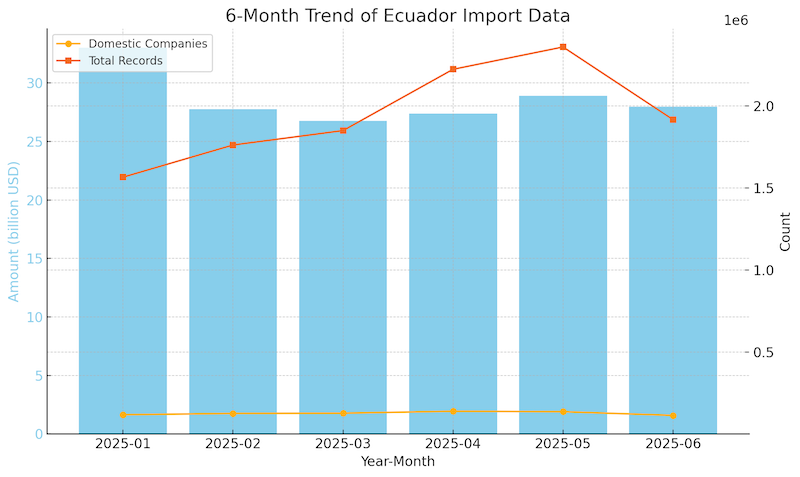 Over the past six months, Ecuador’s import values have exhibited moderate fluctuations. January 2025 began with the highest volume at $3.30 billion, followed by a dip to $2.78 billion in February and $2.68 billion in March. A mild recovery was observed in April ($2.74 billion) and May ($2.89 billion), before easing again to $2.80 billion in June. Company participation mirrored these changes, peaking in April at over 138,000 importers and declining to 113,403 in June. Record volume also decreased in parallel, signaling slightly lower transactional activity overall..png)