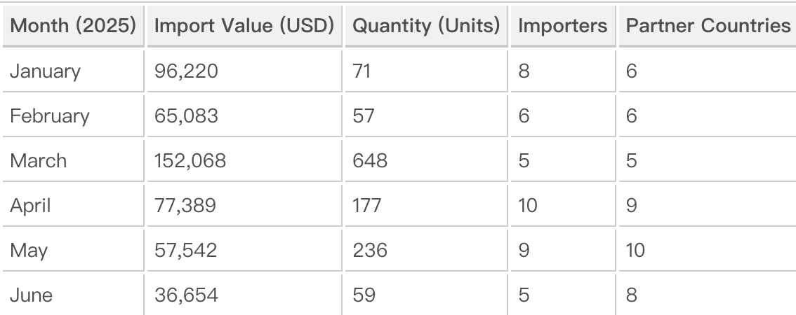 In March 2025, the import value peaked at USD 152,068, driven primarily by several large-scale shipments from Germany. This month alone accounted for nearly one-third of the total half-year import value. The subsequent months, from April through June, saw a moderate contraction, likely linked to seasonal adjustment in Chile’s automotive assembly and heavy-equipment maintenance sectors.