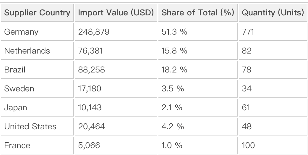 In the first half of 2025, Germany emerged as the top supplier, providing USD 248,879, equivalent to 51 % of Chile’s total import value for HS 90328900. This clearly places Germany as the dominant trade partner for control units, followed by the Netherlands, Brazil, and Sweden.