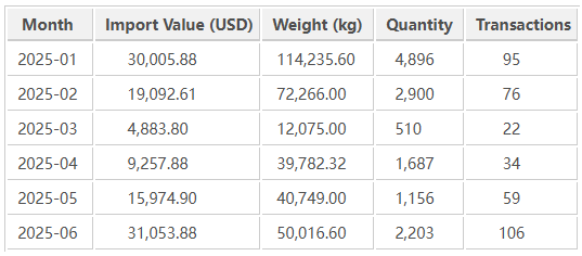 After a low point in March, imports rebounded significantly from April onward, reaching their highest monthly value in June (USD 31,053.88). The surge was primarily driven by restocking from Chinese suppliers and the seasonal increase in consumer demand during the mid-year shopping period.