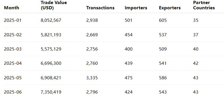 During this six-month period, India recorded 17,254 transactions, involving 1,316 importers, 1,682 exporters, and trade links with 55 countries.