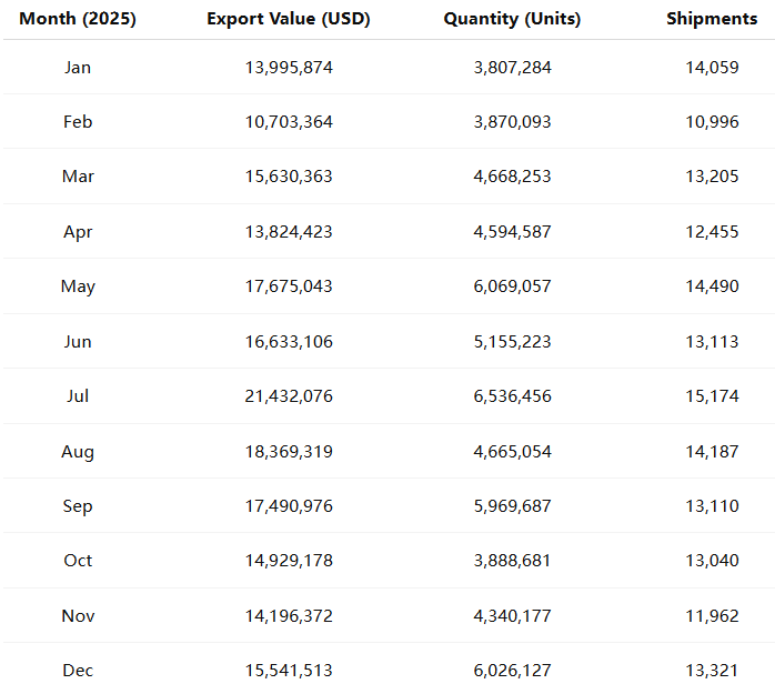 The stable monthly pattern reflects consistent export demand driven by international retailers and wholesalers preparing for annual home décor and gifting seasons.