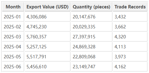 Vietnam’s monthly export trend for plastic trays in early 2025 shows a steady and balanced growth pattern, peaking in March and May: