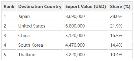 Vietnam’s plastic tray exports are widely distributed across Asia and North America. The top five destinations by export value are as follows: