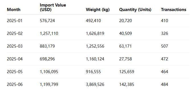 Between January and June 2025, Paraguay’s metal furniture imports showed an overall upward trend. The total value grew from USD 576,724 in January to USD 1,199,799 by June. Monthly details are summarized below: