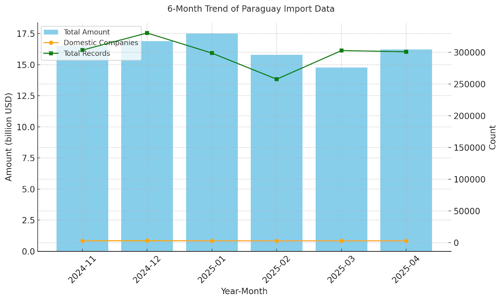 Paraguay’s total imports reached $1.62 billion in April 2025, marking a notable 9.85% increase over the previous month. The rebound—recorded across more than 300,000 import transactions—reflects rising industrial demand and stable procurement momentum. This update is based on real-time customs intelligence from NBD DATA, a global trade analytics platform tracking more than 3 million companies worldwide.