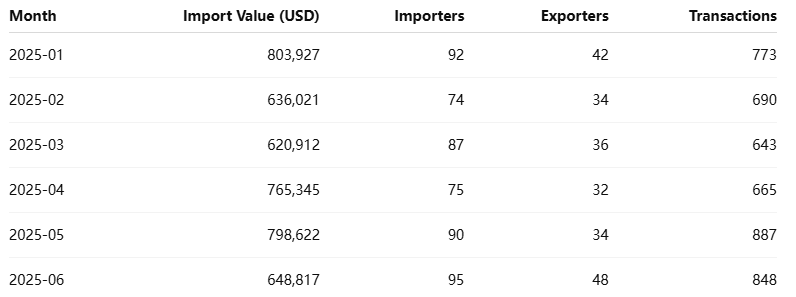 Between January and June 2025, import activity remained steady, with monthly import values ranging between USD 620,000 and USD 800,000, reflecting stable consumer demand in both the retail and hospitality sectors.