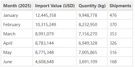 Pakistan’s monthly import trends indicate stable sourcing activity across the first half of 2025, with visible fluctuations linked to seasonal textile demand and cotton substitution cycles.