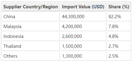 The supplier structure reveals a dominant role played by Chinese producers, alongside regional manufacturers in Malaysia and Fujian Province.