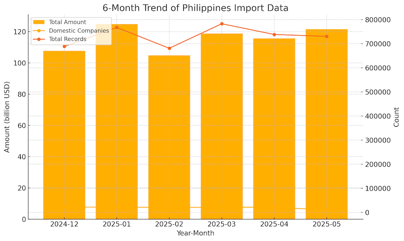 In May 2025, the Philippines recorded a total import value of $12.16 billion, marking a 5.05% increase compared to $11.57 billion in April. This growth was supported by 730,133 trade records, underscoring sustained trade activity. The uptick was largely fueled by surging demand in automotive and electronics sectors, aligning with broader regional supply chain dynamics.