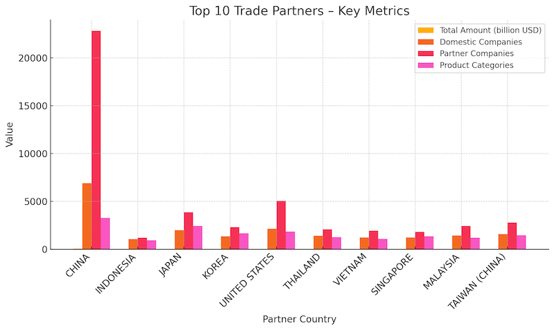 Japan followed closely at $942 million, with 1,965 local importers sourcing from 3,842 Japanese suppliers. Covering 2,403 product lines, the bilateral trade continues to be bolstered by automotive and high-tech equipment imports.