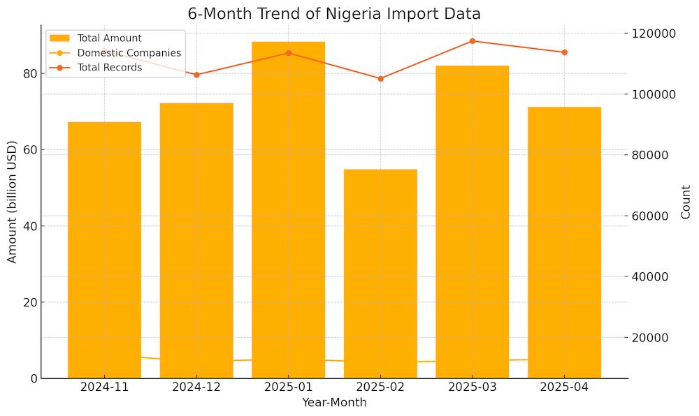 Nigeria’s imports have fluctuated significantly over the past six months. After peaking at USD 8.83 billion in January, total imports fell sharply in February before rebounding in March and dipping again in April. Interestingly, the number of active importers has stayed relatively steady throughout the period, hovering between 11,800 and 14,300, indicating that businesses are adjusting purchasing strategies rather than exiting trade altogether.