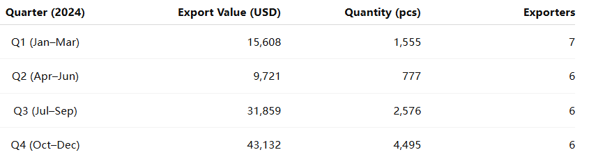 Exports of women’s trousers from Indonesia in 2024 displayed a strong seasonal pattern, with peaks in Q1 and Q4, aligning with international production and fashion cycles.