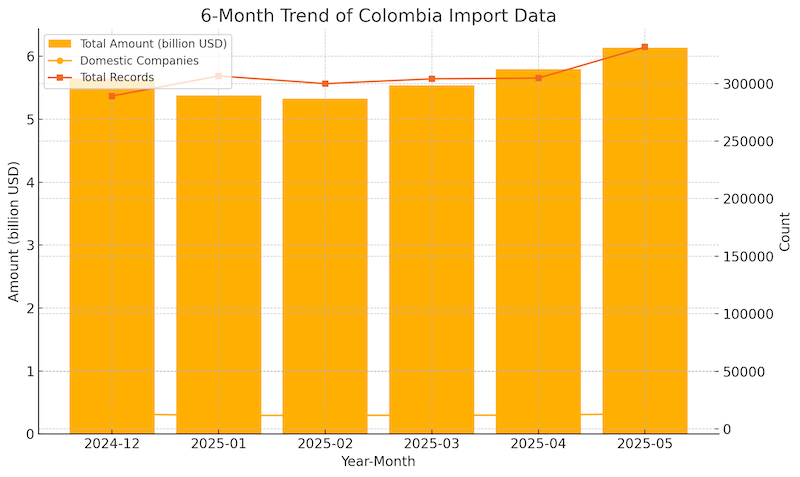 Over the past six months, Colombia’s import volume demonstrated a steady upward trend, particularly after a dip in early 2025. From December 2024’s $5.65 billion, the figure declined slightly in January and February, followed by consecutive growth through March, April, and May. Notably, the number of domestic import companies climbed from 11,709 in February to 13,205 in May, while the total monthly transaction count increased by over 30,000 entries within the same period. This suggests growing commercial engagement and a diversification in sourcing activity..png)