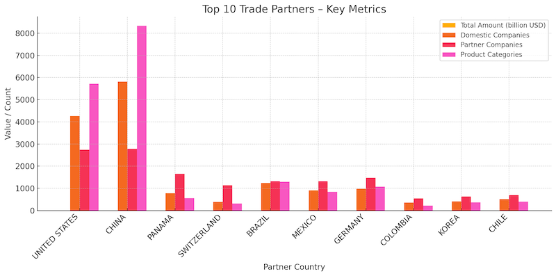 Panama stood out with $341 million in trade, facilitated by 774 Colombian firms and 1,658 Panamanian suppliers. As a strategic transshipment and re-export hub, Panama’s importance lies in its logistical advantage and flexibility across diverse commodity types.