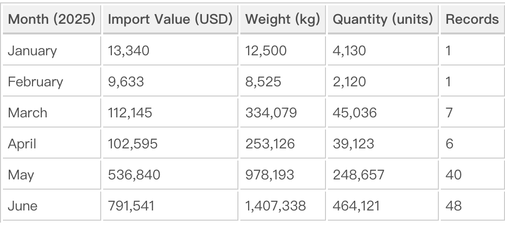 Imports began modestly in the early months, averaging below USD 15 k per month in January–February, before accelerating rapidly from March onward. The surge in May and June, totaling nearly USD 1.33 million, suggests a rebound in building materials demand and pre-stocking for upcoming construction projects in Colombia’s urban centers such as Bogotá and Medellín.