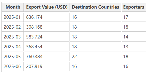 Mexico’s SOPORTE exports showed steady activity throughout early 2025, with the highest export value recorded in May 2025 at USD 760,383, followed by March and January. Early-year performance indicates robust regional demand for vehicle components across North and South America.