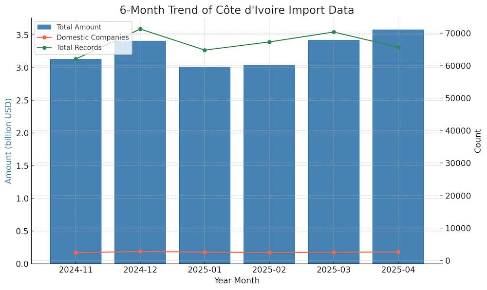 n April 2025, Côte d'Ivoire’s import total reached $3.59 billion, reflecting a 4.83% month-on-month increase from $3.42 billion in March. The country recorded 65,637 import transactions, showing a steady increase in trade activity. This growth highlights the expanding economic opportunities in Côte d'Ivoire, driven by both domestic demand and enhanced global trade relations. The data provided by NBD DATA further emphasizes the dynamic nature of Côte d'Ivoire’s international trade.