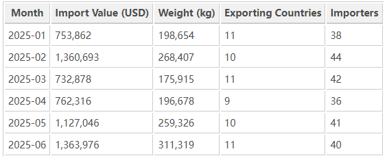 The Philippines demonstrated consistent import activity throughout the first half of 2025, with peaks in June and February. June registered the highest trade value at USD 1.36 million, accounting for more than one-fifth of the semester’s total. The February and May figures also reflected strong industrial demand, likely linked to beverage and consumer goods production cycles.