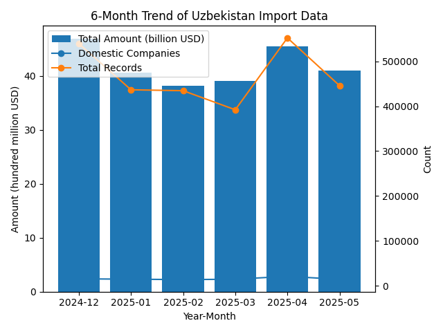 From December 2024 through May 2025, Uzbekistan’s import trajectory exhibited marked volatility. In December, imports peaked at $4.693 billion with 15,472 active domestic buyers and 539,192 records. January saw a pullback to $4.056 billion as buyer count dipped to 14,682 and records to 436,569. February continued the descent to $3.823 billion, 13,732 buyers, and 434,523 records. A modest recovery in March brought values to $3.906 billion (14,600 buyers, 392,060 records), followed by a stronger rebound in April at $4.548 billion, fueled by 21,049 buyers and 552,099 records. May’s near-10% decline suggests short-term recalibration after inventory build-up earlier in the spring.