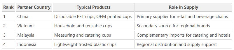 Trade analysis shows that China continues to be the leading supplier of plastic cups to the Philippines, delivering cost-efficient disposable and PET-based cup models. Chinese manufacturers provide a wide range of products — from custom-printed beverage cups to measuring and catering cups — meeting the demands of café chains and event service providers.