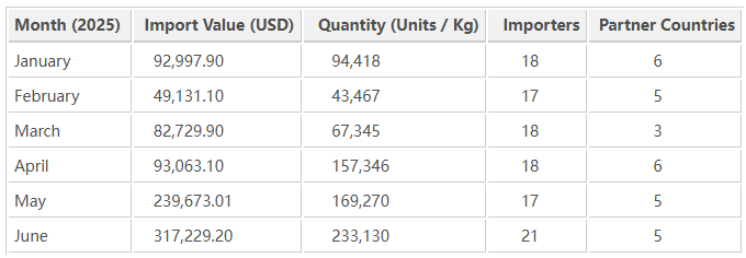 Between January and June 2025, total imports reached USD 874,824, equivalent to approximately 764.9 tons of plastic cups and related products. The country received 203 shipments from 8 partner nations, with imports handled by 69 companies and supplied by 85 exporters.