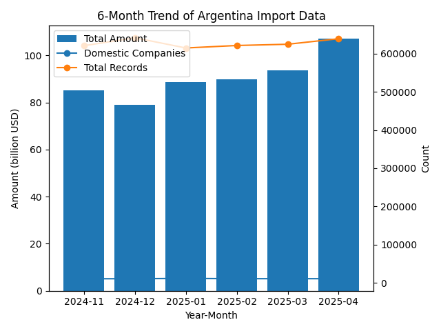 In April 2025, Argentina’s import market demonstrated a robust rebound, with total import value reaching USD 10.7277 billion in April—up 14.47% from March’s USD 9.3713 billion—across 638,774 recorded transactions. This uptick underscores a renewed vigor in domestic demand and supply chain normalization, signaling a promising start to Q2 for regional trade dynamics. Insights presented herein are powered by NBD DATA.