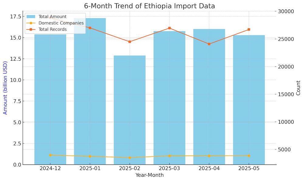 Over the past six months, Ethiopia’s import performance has shown a fluctuating trend. From USD 1.54 billion in December 2024, imports surged to USD 1.73 billion in January, dipped to USD 1.29 billion in February, then rebounded to USD 1.58 billion in March and USD 1.60 billion in April before tapering off in May. The number of domestic importers remained relatively stable, fluctuating modestly between 3,500 and 3,900. This pattern suggests strong underlying trade resilience despite cyclical adjustments.