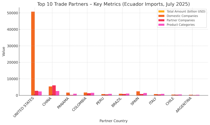 Colombia ranked fourth with $183 million, involving 1,721 Ecuadorian importers and 1,297 Colombian suppliers, spread across 1,526 categories, with agricultural commodities and construction materials being prominent.