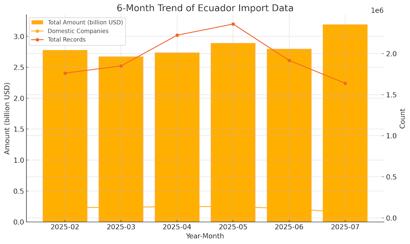 Over the past six months, Ecuador’s import value has demonstrated a steady upward trend, peaking in July after a moderate dip in June. February recorded $2.78 billion in imports, followed by a slight decline in March to $2.68 billion. April and May saw renewed momentum at $2.74 billion and $2.89 billion, respectively, before a drop to $2.80 billion in June. July’s rebound to $3.19 billion coincided with a notable contraction in the number of domestic importers, from 113,403 in June to 65,277 in July, suggesting concentration of larger import transactions among fewer but possibly more capital-intensive companies. Transaction volumes mirrored this contraction, dropping from 1.92 million records in June to 1.64 million in July, indicating a possible shift toward high-value goods..png)