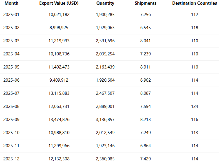 India’s export flow remained consistent throughout 2025, with notable peaks in September and July — months that coincide with high-volume purchasing from global OEMs and distributors.