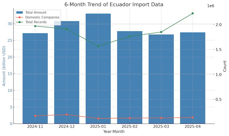 Over the past six months, Ecuador’s imports have seen notable fluctuations. The country peaked at $3.3 billion in January, followed by a downward adjustment in February ($2.78 billion) and March ($2.68 billion). April’s rebound to $2.74 billion suggests a stabilizing trend. Meanwhile, the number of domestic importing companies has increased, from 126,971 in March to 138,683 in April, alongside a sharp rise in import record volume, now exceeding 2.22 million. This signals an expansion in transaction count and possibly more diversified procurement strategies across industries.