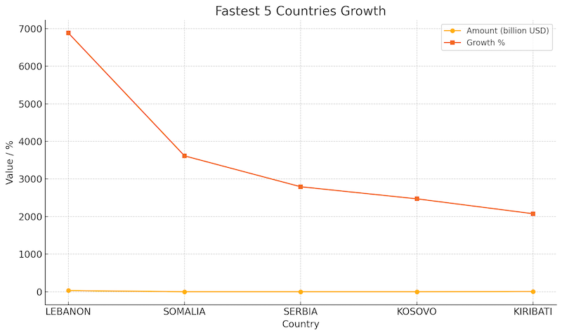 The most dramatic month-on-month growth came from Lebanon, whose exports to Ecuador jumped by 6,882.57%, totaling $31.6 million—possibly due to large one-off shipments or new trade channels. Similarly, Somalia (+3,613.86%), Serbia (+2,792.48%), and Kosovo (+2,471.34%) showed sharp, albeit low-base growth. Meanwhile, Kiribati, a Pacific Island nation, grew over 2,000%, reaching nearly $5.8 million, which could point to specialized commodity flows or logistics partnerships.