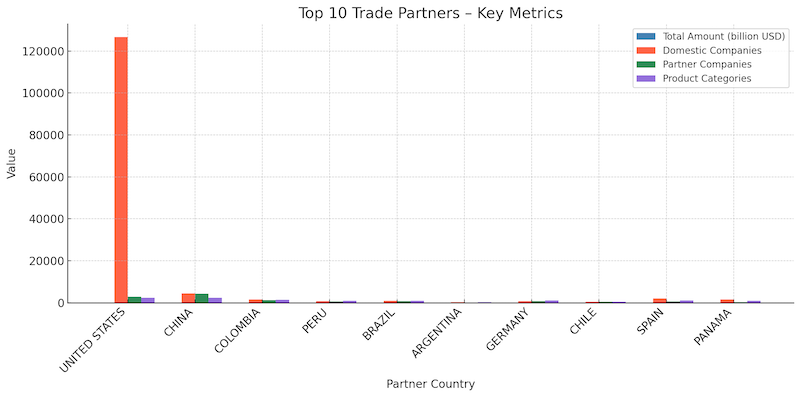 The remaining six partners—Brazil, Argentina, Germany, Chile, Spain, and Panama—each contributed between $57 million and $112 million. While smaller in volume, their diversity in categories (from vehicles to pharmaceuticals and chemicals) suggests broad multi-sector trade resilience.