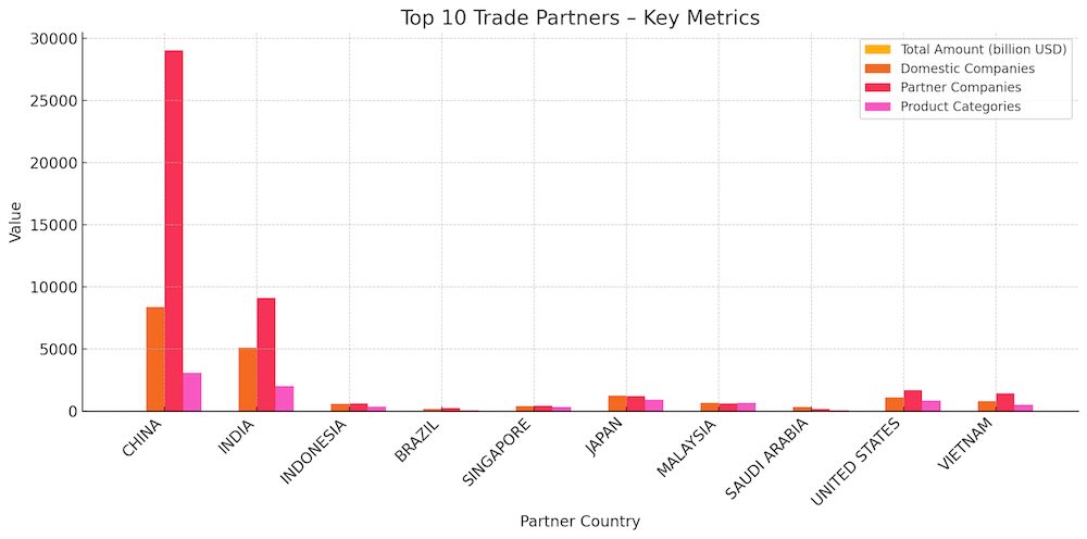 Other notable partners include Singapore, Japan, Malaysia, Saudi Arabia, the United States, and Vietnam. Together, they accounted for nearly $13 billion in cumulative trade value, enhancing the country’s access to electronics, chemicals, and finished goods.