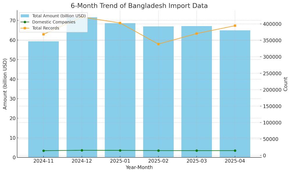 The past six months reveal a gradual downward trajectory in import volume following a peak of $7.16 billion in December 2024. While April’s figure marks a continued decline, Bangladesh’s import ecosystem has proven resilient. 14,706 domestic firms were active in April—broadly in line with previous months—while the total number of records increased for the second consecutive month, pointing to a possible shift toward smaller, more frequent orders and diversified sourcing.