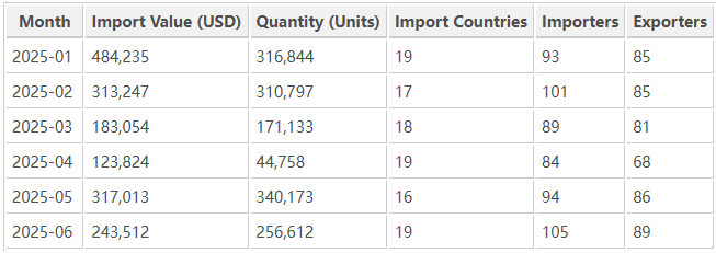 During January–June 2025, import values remained relatively balanced, with notable peaks in January (USD 484,235) and May (USD 317,013). Import volume was consistent, averaging around 240,000–300,000 units per month, highlighting Ecuador’s stable consumption in industrial and commercial applications.