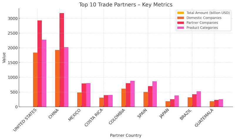 Mexico took third position at $55 million, with a balanced ecosystem of 485 Panamanian importers and 793 Mexican suppliers, indicating strong regional ties and cost-efficient logistics. Costa Rica followed with $41 million, backed by 308 Panamanian companies trading with 393 Costa Rican partners across 400 goods—a testament to Central American intra-regional trade.
