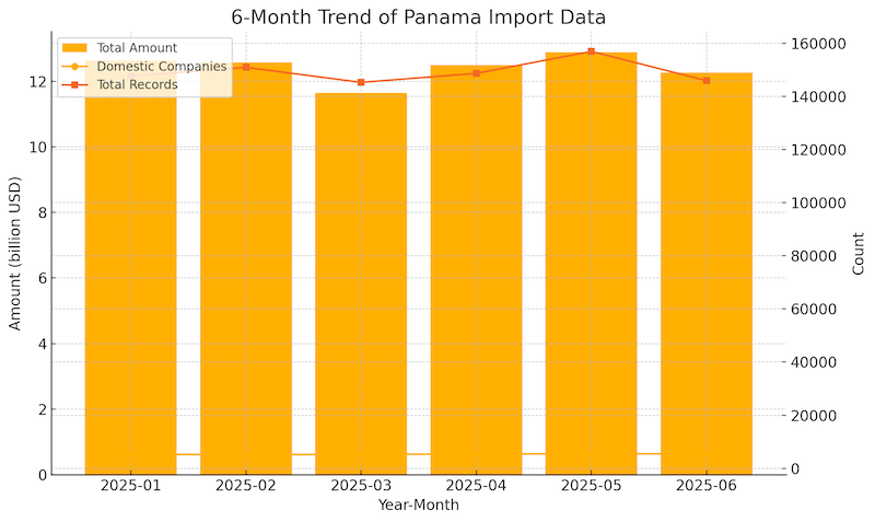 Over the past six months, Panama’s import value has fluctuated between $1.16 billion and $1.29 billion. January 2025 started strong at $1.26 billion, followed by minor volatility through April. May marked the highest value in the half-year window before June’s decline. The number of domestic importers remained stable, peaking in May with 5,452 active companies. Record volumes followed a similar trajectory, aligning closely with total trade activity..png)