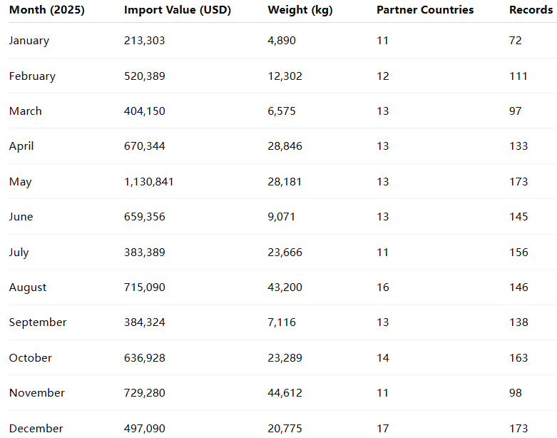 Monthly imports remained above USD 400,000 most of the year, indicating consistent project-based procurement. May registered the year’s peak at USD 1.13 million, mainly due to bulk deliveries for Danfoss and Schneider Electric systems in industrial automation upgrades.