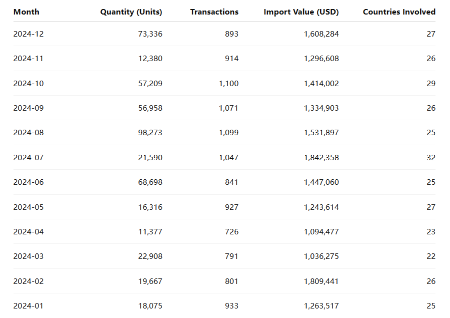 Indonesia’s monthly imports of couplings maintained a steady upward momentum in 2024. The highest import quantity occurred in August (98,273 units), while December (73,336 units) also saw strong demand, indicating an extended industrial peak season.