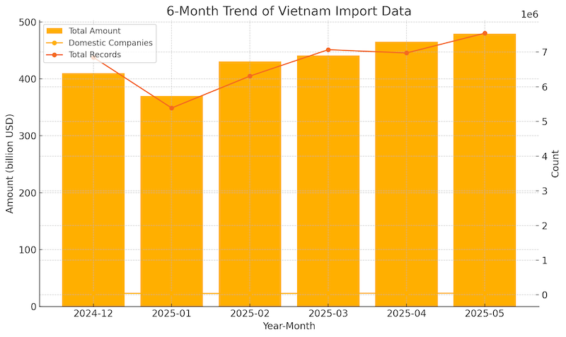 Over the past six months, Vietnam’s import performance has shown steady momentum. From December 2024 to May 2025, the monthly import value rose from USD 41.03 billion to USD 47.91 billion. Although January 2025 experienced a seasonal dip to USD 36.97 billion, figures rebounded sharply in February and continued climbing in the following months. The number of participating domestic companies has steadily increased—from 40,996 in January to 46,522 in May—indicating broader business engagement. Similarly, record volume surged from 5.38 million in January to over 7.54 million in May, marking the highest level within the period..png)