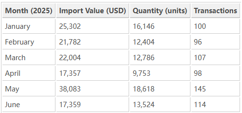 Imports surged in May, likely due to procurement ahead of mid-year retail peaks and institutional restocking, especially from supermarkets and hospitality operators. Overall, the market showed balanced performance, averaging roughly USD 23,600 per month.