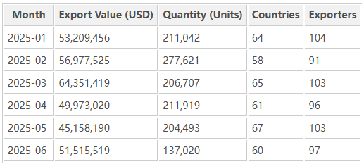 The strongest performance was observed in March 2025, with over USD 64 million in exports, while February achieved the highest shipment count. The diversity of export destinations indicates that Indian manufacturers are expanding across multiple continents, especially toward the Middle East and Southeast Asia.