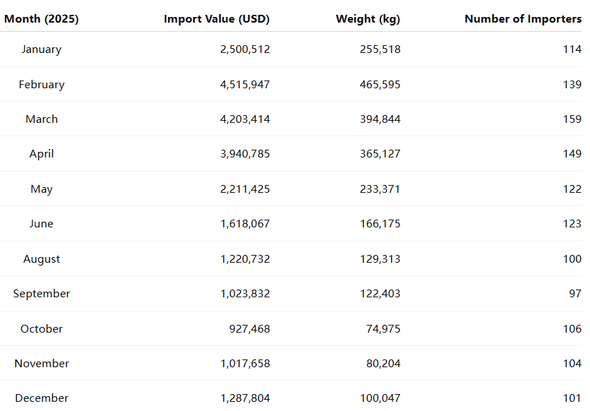 Imports peaked in February, when shipments exceeded 465 tons, followed by a second-highest level in March. The period from May to September saw moderate import volumes as retailers transitioned between collections. By December, the total weight climbed again, preparing for the summer season and year-end retail promotions.