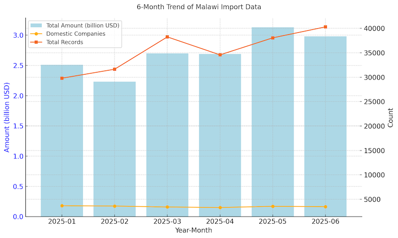 During the past six months, Malawi’s monthly import value has fluctuated between $223 million and $313 million. January began with $251 million and peaked in May at $313 million, before tapering slightly in June. Concurrently, the number of active importing companies remained relatively stable, averaging just under 3,500, while the number of recorded transactions climbed from 29,793 in January to 40,303 in June. This indicates an uptick in operational intensity despite the moderate decline in monetary value..png)